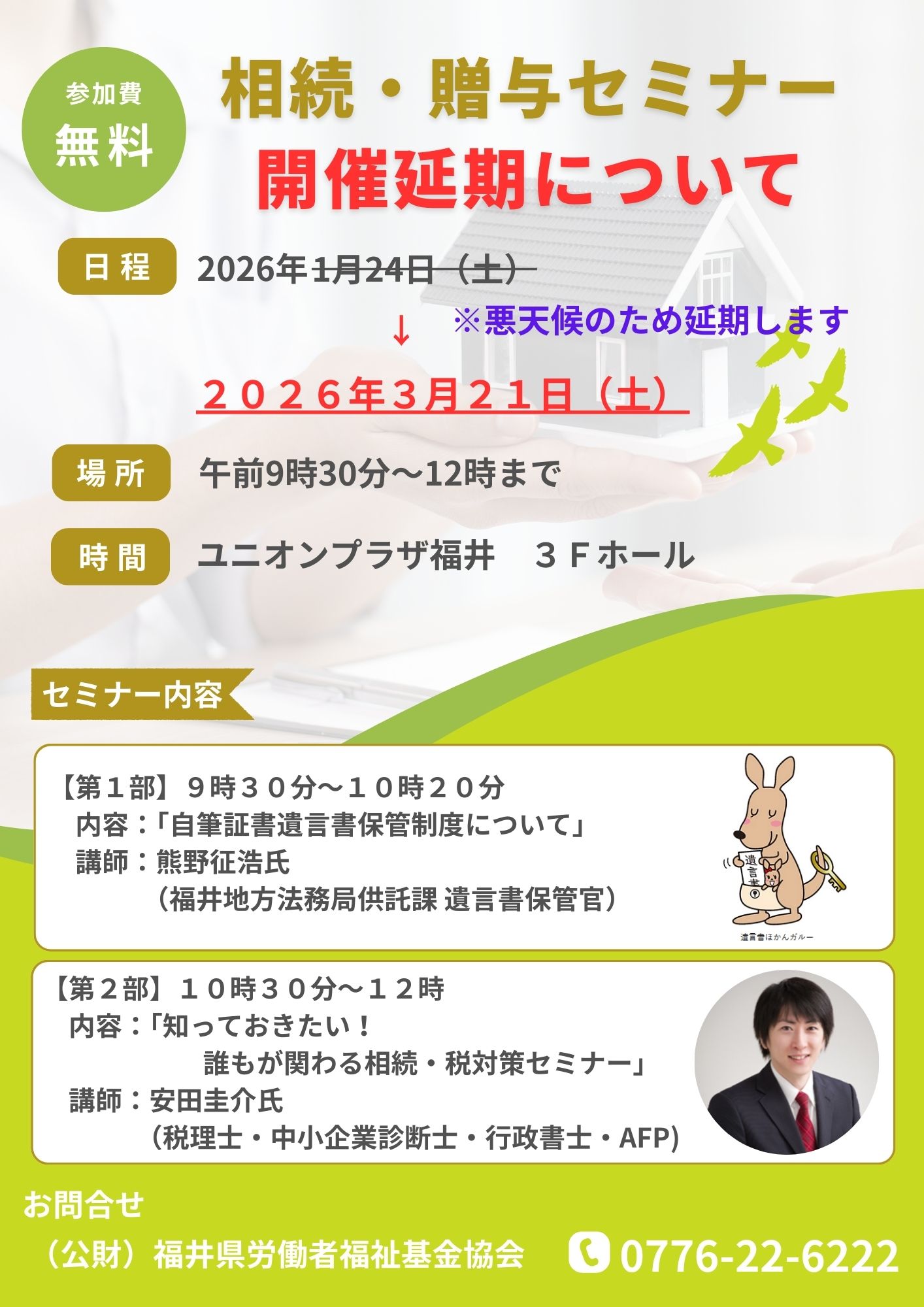 1月24日(土)に開催を予定しておりました「相続・贈与セミナー」につきましては、大雪による交通機関の乱れや皆さまの安全を考慮し、開催を延期することといたしました。